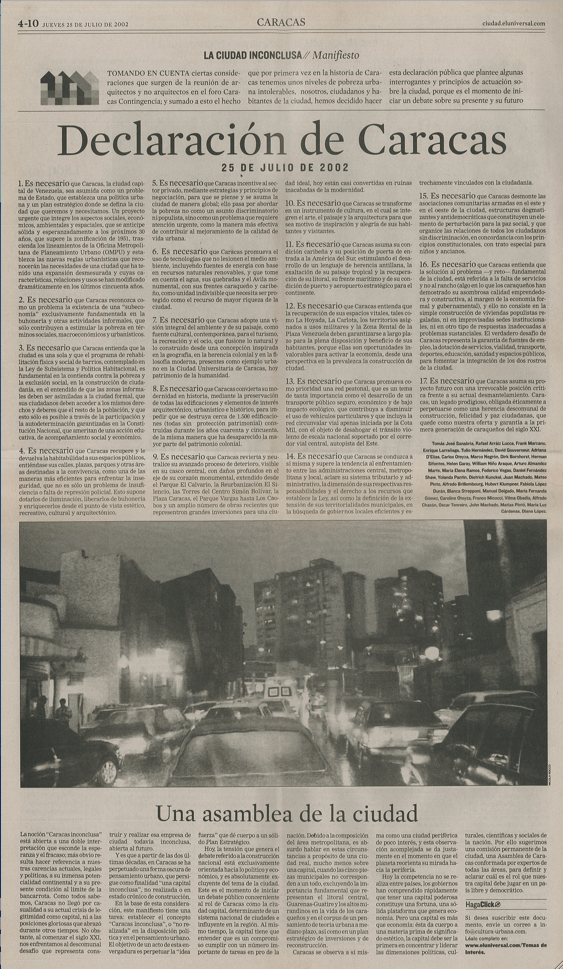 Manifiesto publicado en el suplemento especial Caracas Inconclusa por el 435 aniversario de la ciudad Caracas en el diario El Universal.